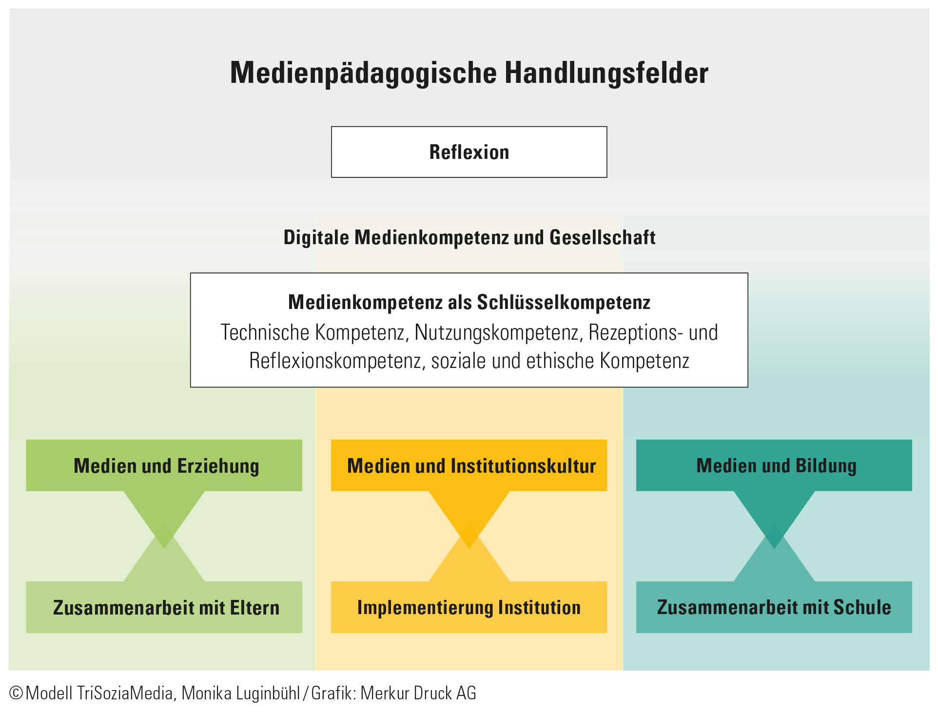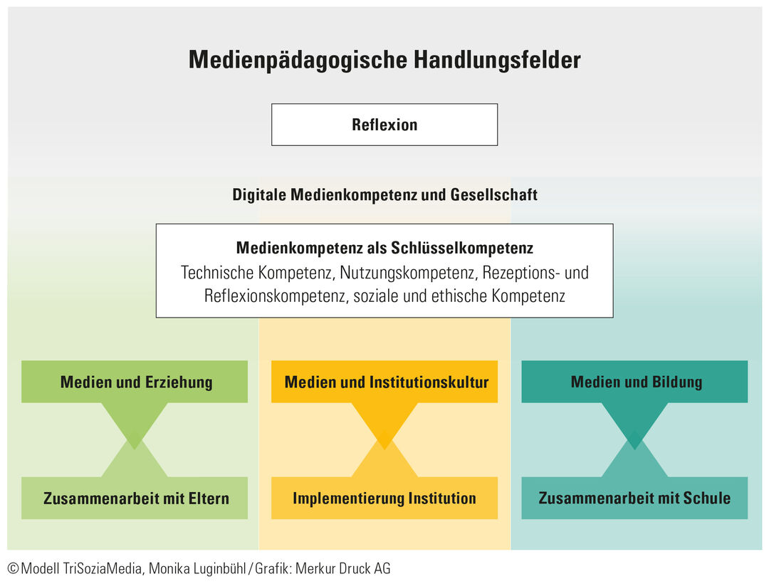 Das Modell TriSoziaMedia zeigt übersichtlich massgebliche Handlungsfelder für den kompetenten Umgang mit digitalen Medien in der sozialpädagogischen Praxis.